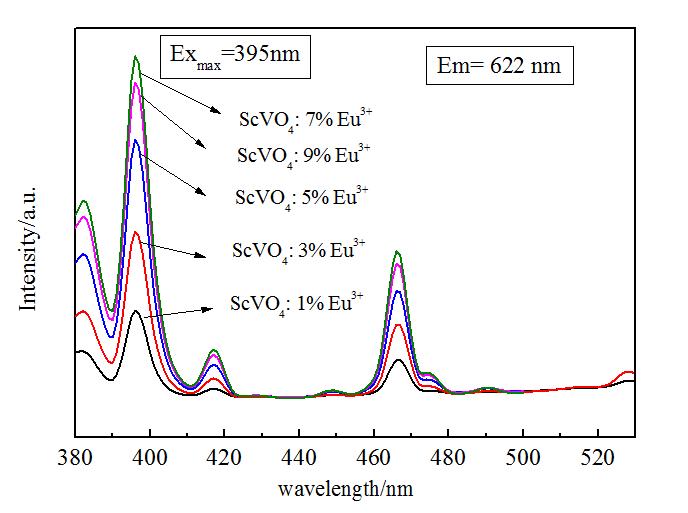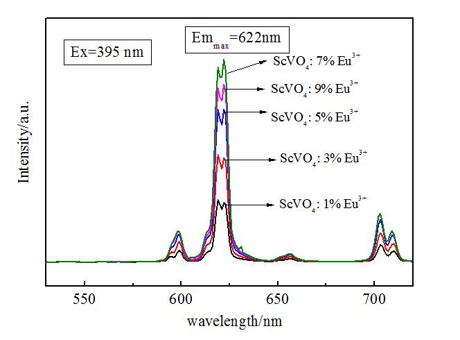 (4)采用高温固相法制备了ScVO4:Eu3+红色荧光粉,所合成的ScVO4:Eu3+红色荧光粉为四方锆石型结构。ScVO4:Eu3+红色荧光粉CIE色坐标为(0.6716,0.3273),是一种有望用于白光LED的高效红色荧光粉。