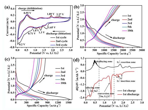 图2 SnS2@RGO 复合材料的循环伏安曲线(a),SnS2@RGO复合材料和纯相SnS2前十次恒流充放电曲线(b) (c)及SnS2@RGO电极的容量差分曲线(d)