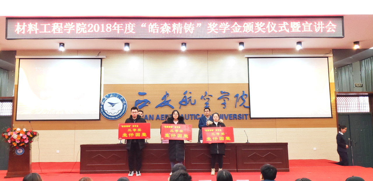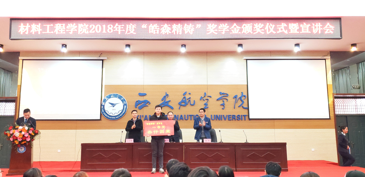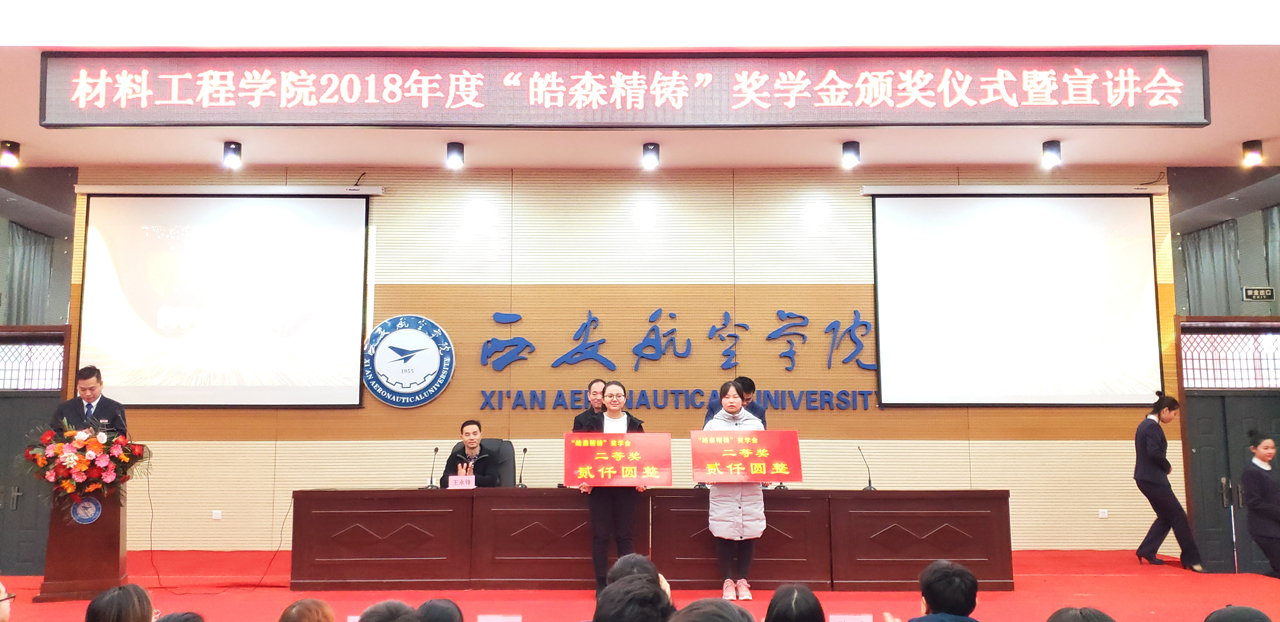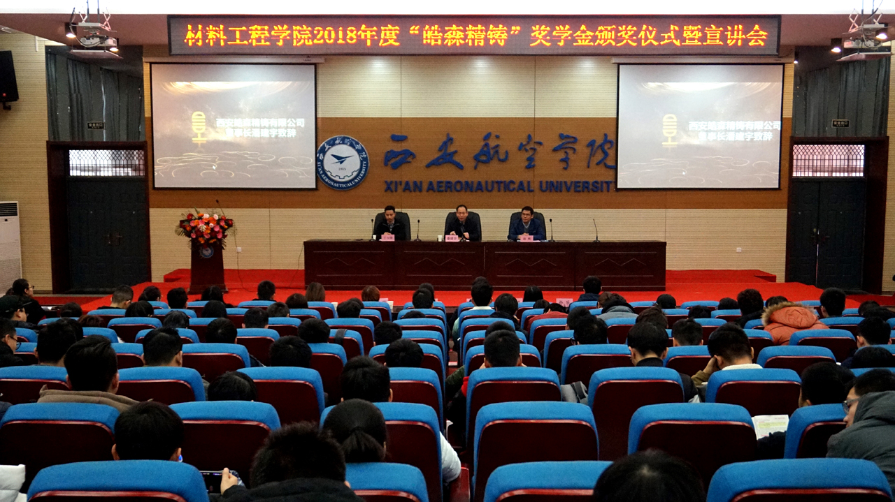 2018年12月14日上午10点30分,beat365中国官方网站2018年度“皓森精铸”奖学金颁奖仪式于阎良校区报告厅举行。出席本次会议的有西安皓森精铸有限公司董事长潘建宇,beat365中国官方网站院长谢辉,党总支书记王永锋以及部分beat365官网教师代表,此次会议由学生管理科科长张赛主持。