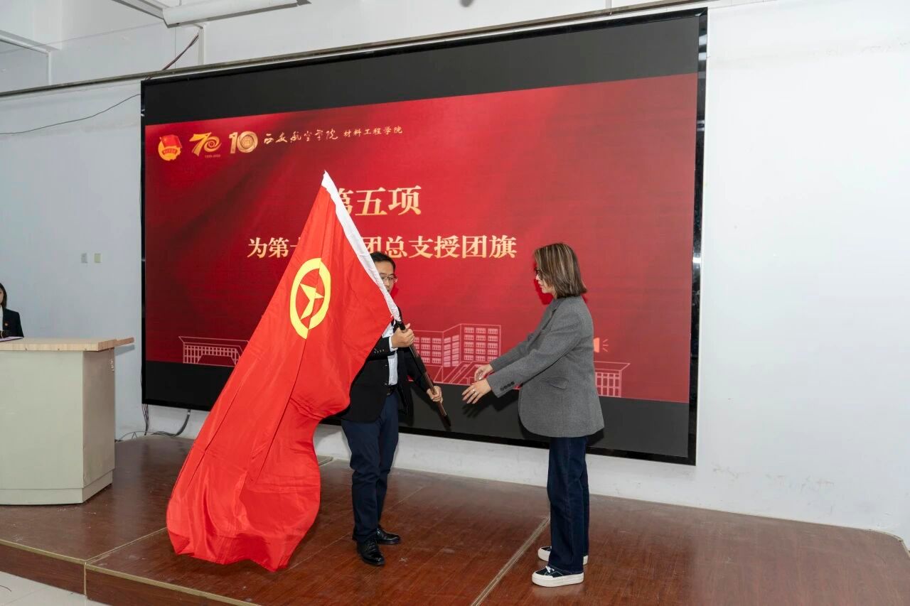 高均立副书记庄重地将承载着beat365中国官方网站团总支责任与荣耀的团旗授予第十一届团总支书记胡欣雨老师。旗帜的传递,是组织的信任,是光荣的延续,更是沉甸甸的使命与担当。