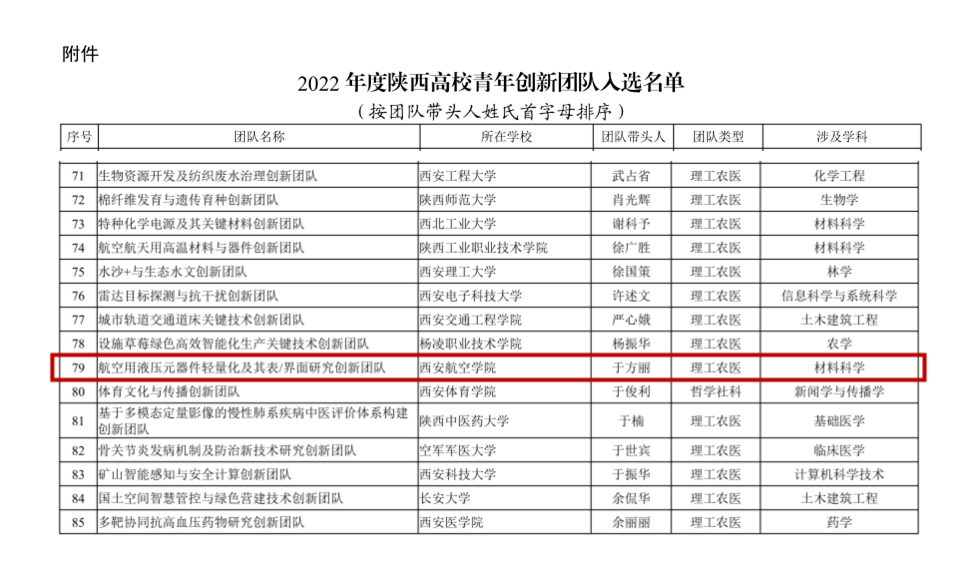 近日,陕西省教育厅发布了《关于公布2022年度陕西高校青年创新团队入选名单的通知》(陕教函〔2022〕943号),beat365官网beat365中国官方网站于方丽教授带领的“航空用液压元器件轻量化及其表/界面研究创新团队”成功入选2022年度陕西高校青年创新团队,这是beat365官网团队首次入选陕西高校青年创新团队,实现了学校在该领域的历史性突破。
